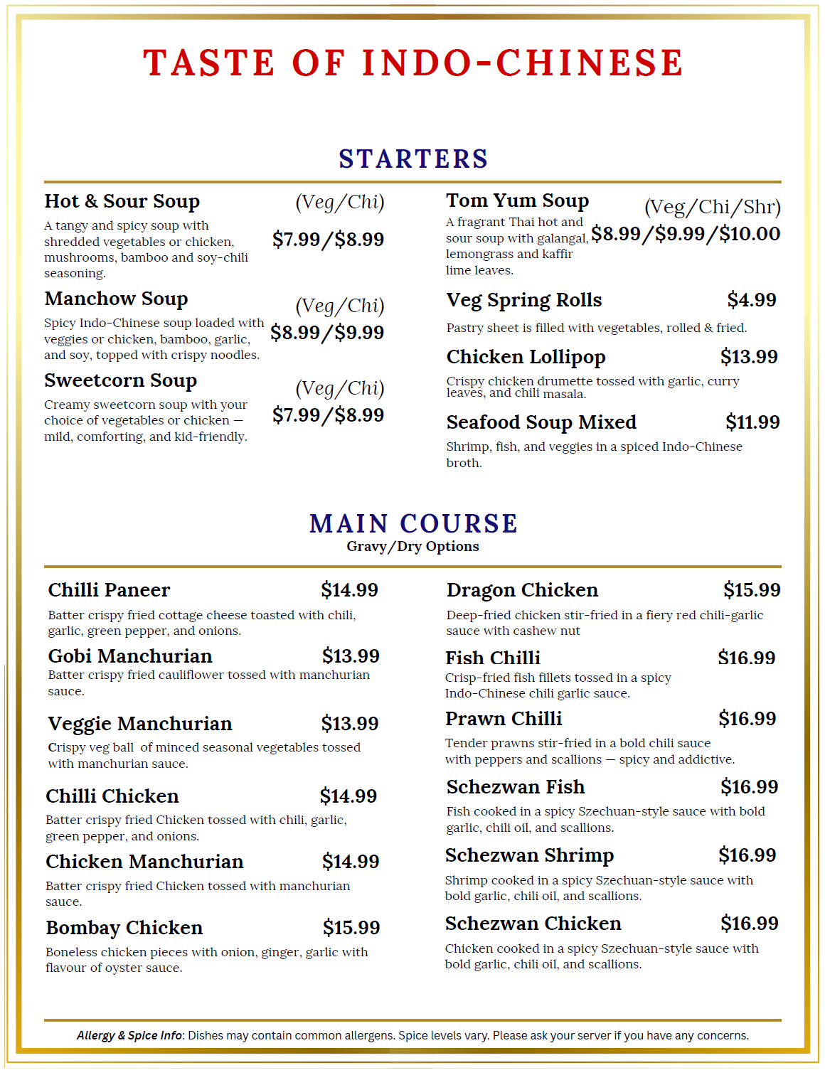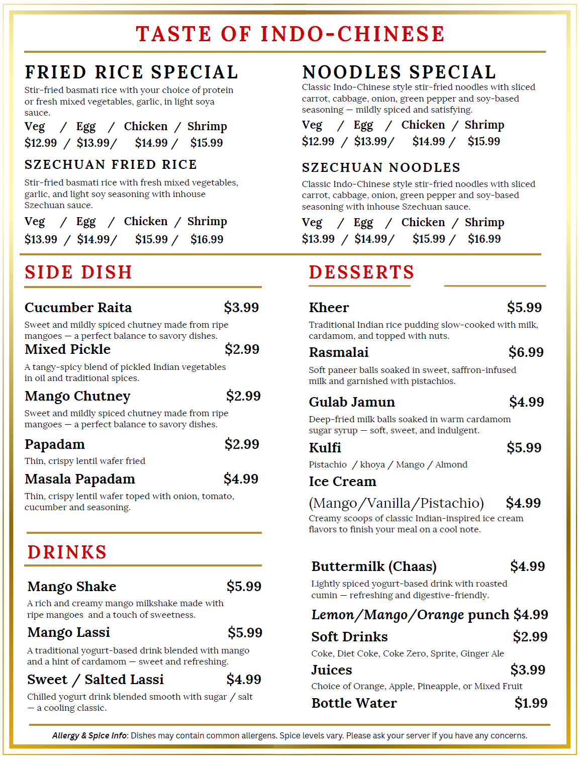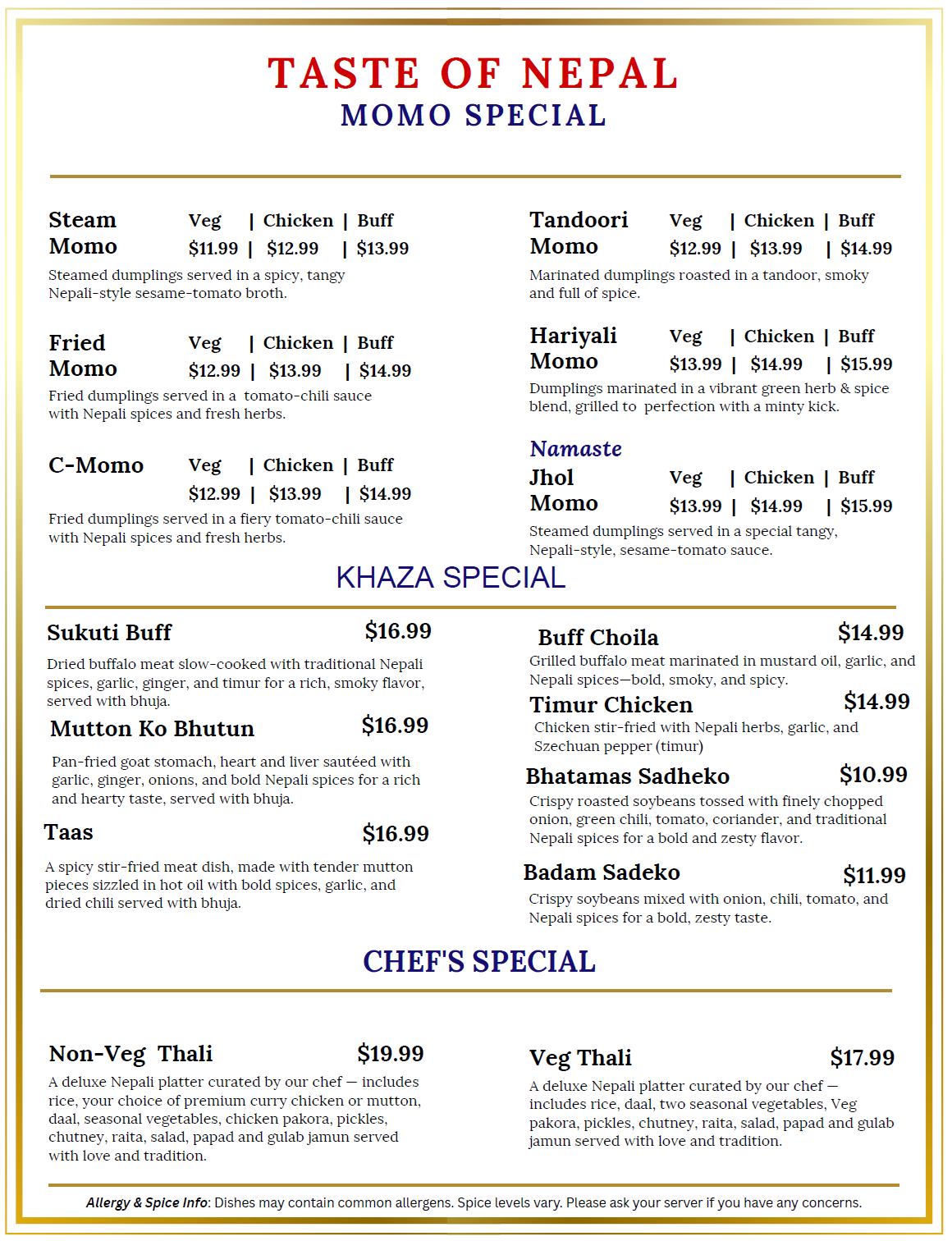 Taste the harmonious convergence of Nepalese, Chinese, and Indian cuisines at our restaurant, offering everything from appetizers to main dishes, sides, sweets, and beverages.